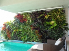 Apartamento de altÃssimo padrão, onde foram feitos três jardins verticais, um na piscina, outro envolvendo uma coluna e um terceiro no home theater.
